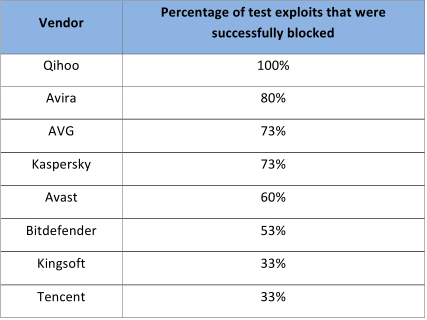 在COSEINC測試中,360安全衛士攔截全部15次漏洞攻擊,防御成功率排名第一;Avira(小紅傘)成功攔截12次攻擊,以80%的攔截率排名第二;卡巴斯基和AVG均攔截11次攻擊,并列第三位。
